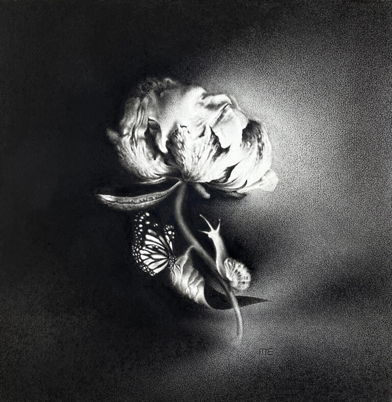 Emsley’s work focuses on the transformation of flowers throughout their brief lifespans, using them as metaphors to express ideas, themes, or emotions. As colors fade and petals wither, she uncovers new possibilities and energy, which she captures using charcoal on paper. This medium allows her to explore the tension between opposing forces such as light and darkness, as well as the internal and external self.