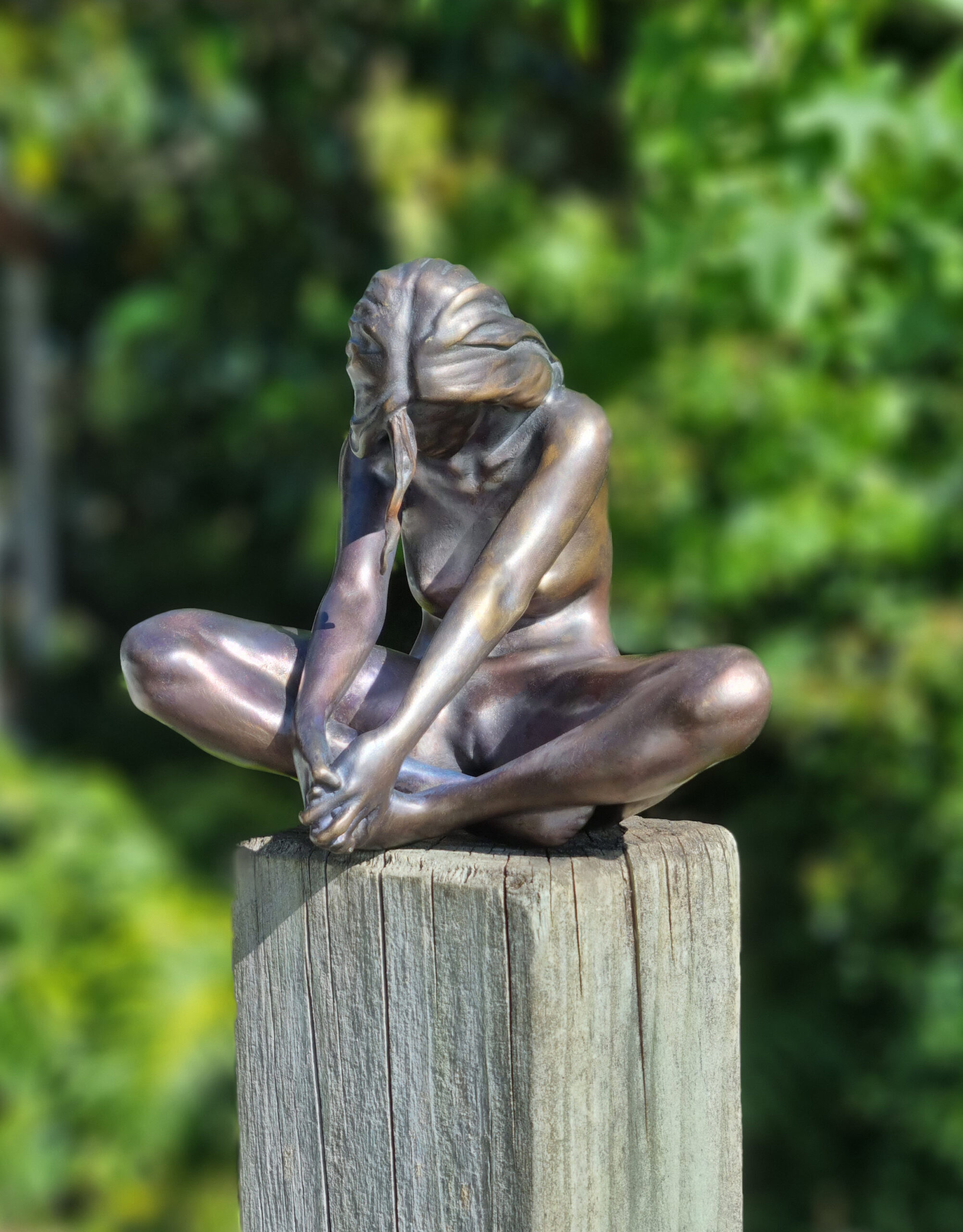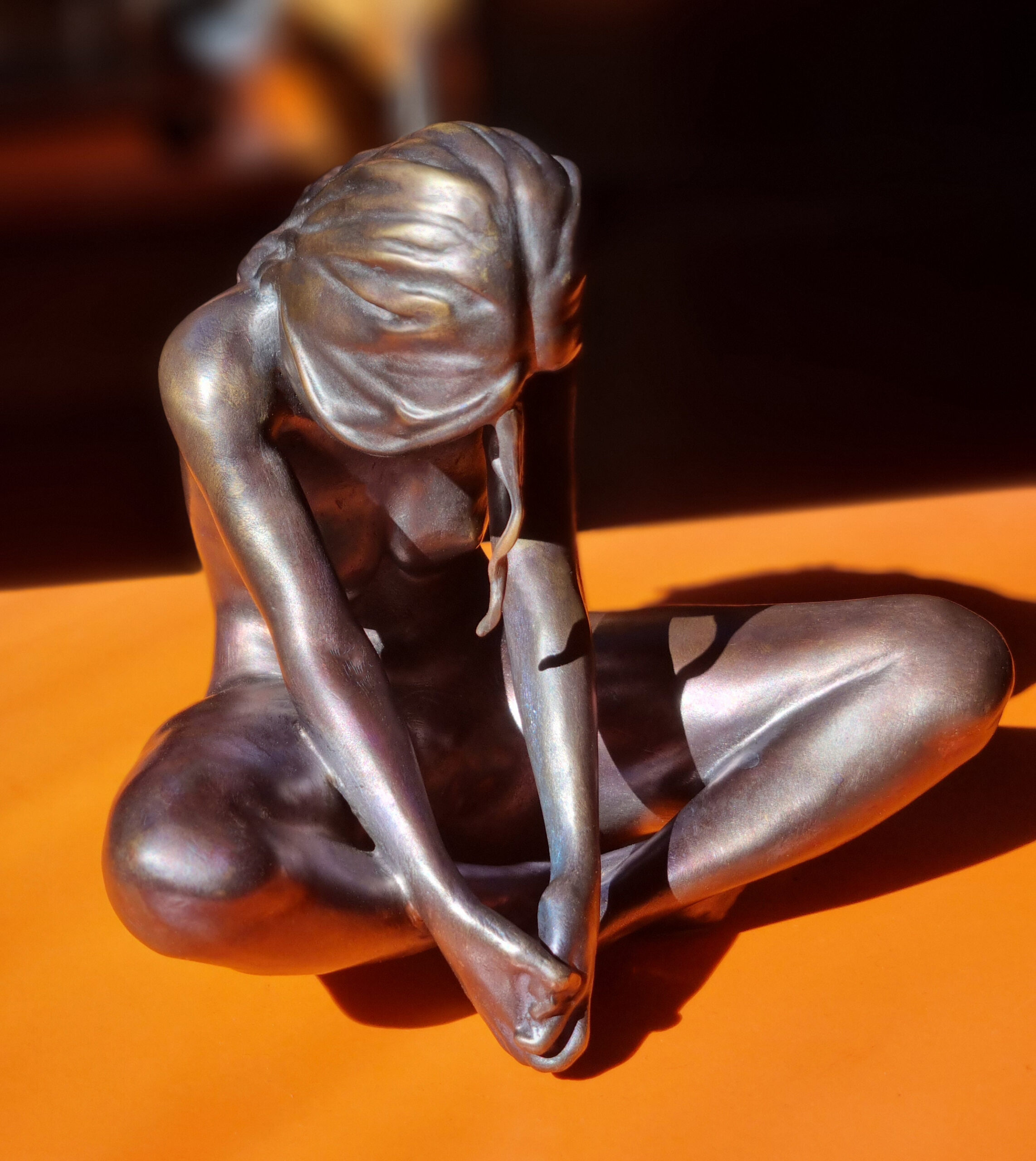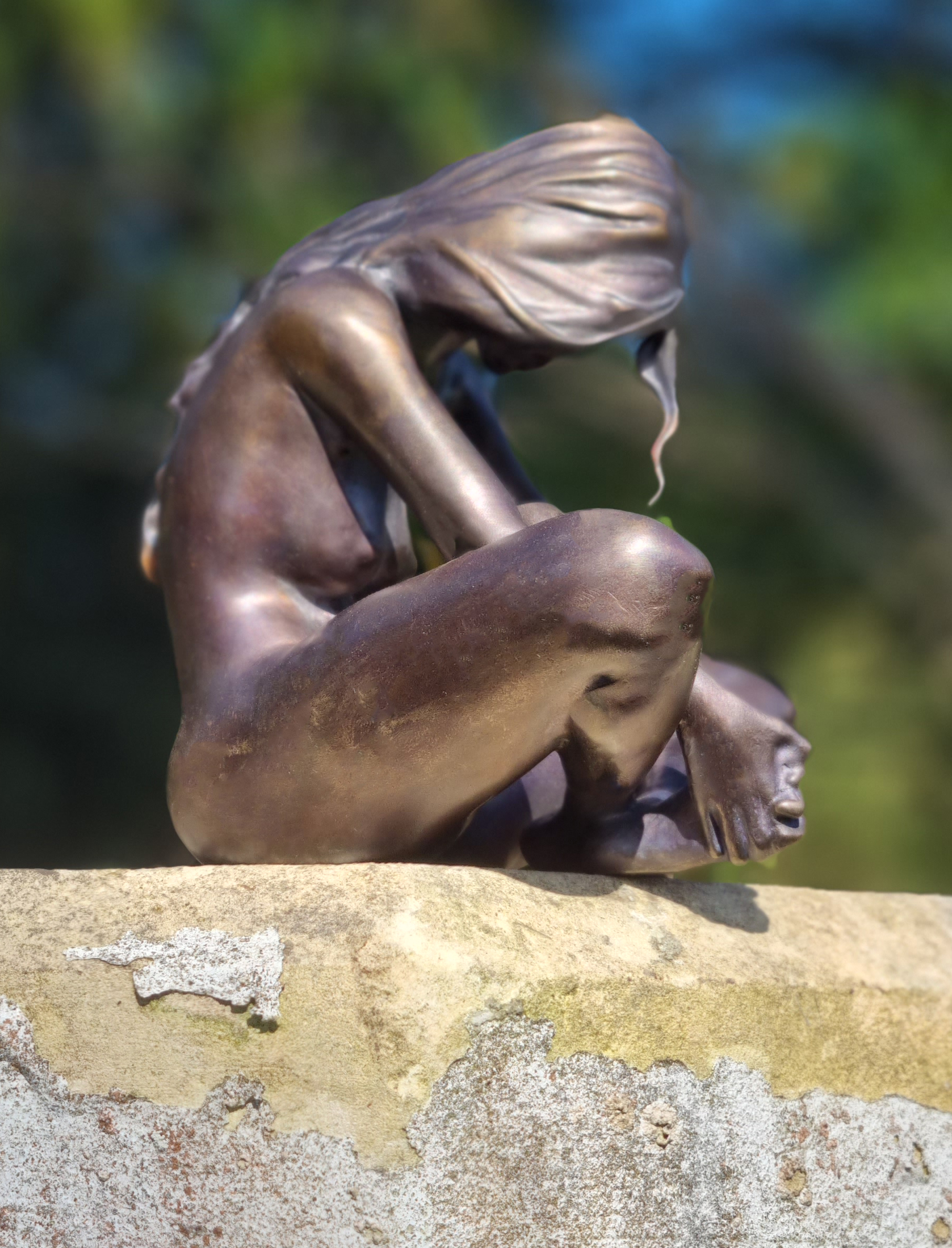 Duhamel’s modelling is tender and precise: the subtle curvature of the back, the relaxed fall of the shoulders, and the delicately rendered hands all contribute to a sense of calm presence. Light glides across the bronze surface, emphasising both the softness of the body and the sculpture’s harmonious, circular composition.