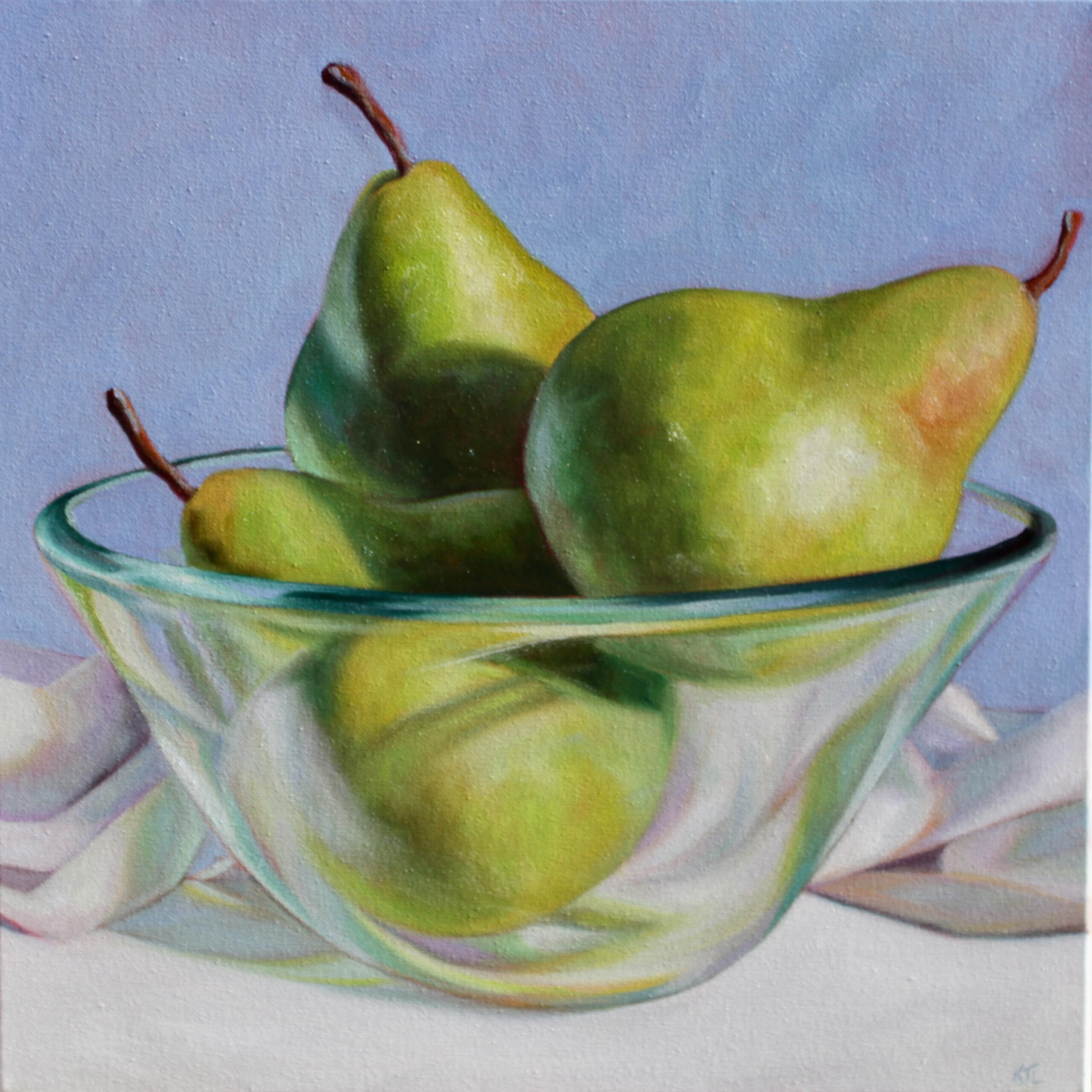 The pears appear fresh and weighty, the glass bowl delicate yet solid, and the drapery soft and luminous. The cool background and the crisp rendering give the work a serene, almost meditative quality—turning an everyday subject into a study of light, transparency, and form.